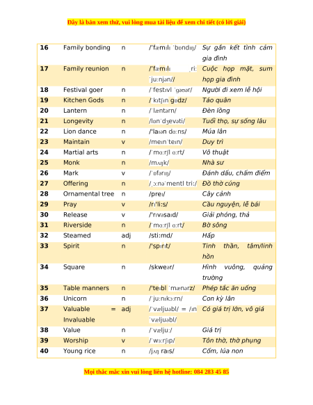 Tuổi thọ, sự sống lâu 22 Lion dance n /'laɪən dɑːns/ Múa lân 23 Maintain v /meɪnˈteɪn/ Duy trì 24 Martial arts n /ˈmɑːrʃl ɑːrt/ Võ thuật 25 Monk n /mʌŋk/ Nhà sư 26 Mark v /ˈɒfərɪŋ/