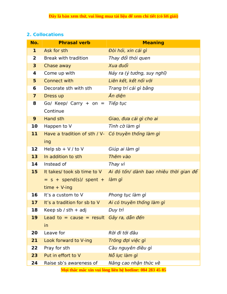 Have a tradition of sth / V- Có truyền thống làm gì ing 12 Help sb + V / to V Giúp ai làm gì 13 In addition to sth Thêm vào 14 Instead of Thay vì 15 It takes/ took sb time to V