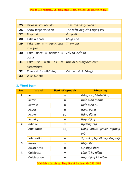 Cảm ơn ai vì điều gì 33 Wish for sth 3. Word form No. Word Part of speech Meaning 1 Act v