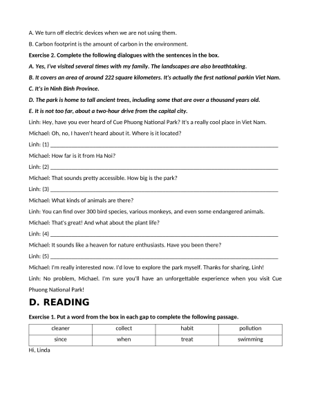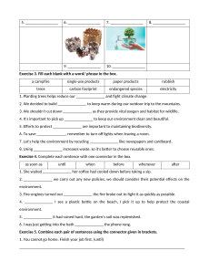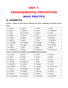 Exercise 1. Choose the word with the underlined part which is differently pronounced from the others. 1. A. absorb B. natural C. marine D. avoid 2. A. factory B. transport C. animals D. endangered 3. A. single B. environment C. dioxide D. device 4. A. wildlife B. organise C. island D. importance 5. A. product B. rubbish C. pollution D. dumping 6. A. pollution B. protect C. carbon D. ecosystem 7. A. suggestion B. extinction C. protection D. pollution 8. A. relate B. private C. celebrate D. participate 9. A. release B. leave C. beach D. earth 10. A. endangered B. release C. ecosystem D. environment