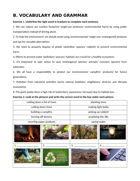 Exercise 2. Choose the word which is stressed differently from the others. 1. A. problem B. global C. species D. protect 2. A. reduce B. carbon C. release D. device 3. A. product B. plastic C. single D. avoid 4. A. volunteer B. programme C. quality D. habitat 5. A. protection B. pollution C. endanger D. animal 6. A. participate B. activity C. celebrate D. environment 7. A. species B. throughout C. wildlife D. product 8. A. tornado B. endanger C. extinction D. habitat 9. A. resident B. importance C. continue D. recycle 10. A. environment B. ecosystem C. successfully D. participate B. VOCABULARY AND GRAMMAR