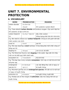 UNIT 7. ENVIRONMENTAL PROTECTION A. VOCABULARY WORD PRONNCIATION MEANING carbon dioxide /ˌkɑːrbən daɪ (n) ˈɒksaɪd/ khí cacbonic/ cacbon đioxit