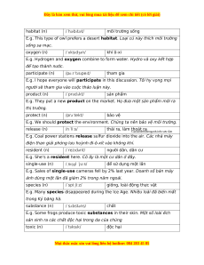endangerer (n) /ɪnˈdeɪndʒərər/ mối đe doạ endangering /ɪnˈdeɪndʒərɪŋ/ tình trạng bị de dọa (adj) extinction sự tuyệt chủng, tuyệt /ɪkˈstɪŋkʃn/ (n) diệt extinct (adj) /ɪkˈstɪŋkt/ tuyệt chủng habitat (n) /ˈhæbɪtæt/ môi trường sống habitable (adj) /ˈhæbɪtəbl/ có thể sống được habitation (n) /ˌhæbɪˈteɪʃn/ sự cư trú, nơi cư trú inhabitant (n) /ɪnˈhæbɪtənt cư dân, người cư ngụ product (n) /ˈprɒdʌkt/ sản phẩm production (n) /prəˈdʌkʃn/ sự sản xuất produce (n) /prəˈdjuːs/ sản lượng produce (v) /prəˈdjuːs/ sản xuất, chế tạo producer (n) /prəˈduːsər/ nhà sản xuất protect (v) /prəˈtekt/ bảo vệ protection (n) /prəˈtekʃn/ sự bảo vệ toxic (adj) /ˈtɒksɪk/ độc hại non-toxic (adj) /ˌnɒn ˈtɒksɪk không độc hại