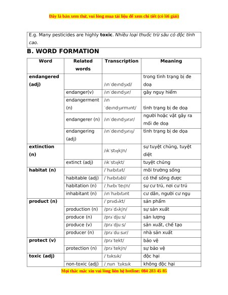 E.g. Many pesticides are highly toxic. Nhiều loại thuốc trừ sâu có độc tính cao. B. WORD FORMATION Word Related Transcription Meaning words endangered trong tình trạng bị đe (adj) /ɪnˈdeɪndʒəd/ doạ endanger(v) /ɪnˈdeɪndʒər/ gây nguy hiểm endangerment /ɪn (n) ˈdeɪndʒərmənt/ tình trạng bị đe doạ người hoặc vật gây ra