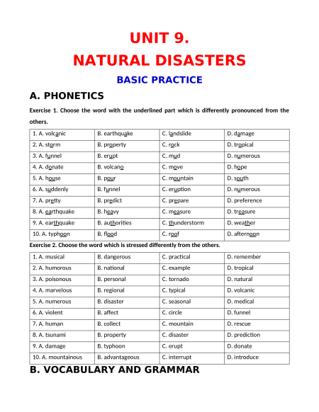 Exercise 1. Choose the word with the underlined part which is differently pronounced from the others. 1. A. volcanic B. earthquake C. landslide D. damage 2. A. storm B. property C. rock D. tropical 3. A. funnel B. erupt C. mud D. numerous 4. A. donate B. volcano C. move D. hope 5. A. house B. pour C. mountain D. south 6. A. suddenly B. funnel C. eruption D. numerous 7. A. pretty B. predict C. prepare D. preference 8. A. earthquake B. heavy C. measure D. treasure 9. A. earthquake B. authorities C. thunderstorm D. weather 10. A. typhoon B. flood C. roof D. afternoon