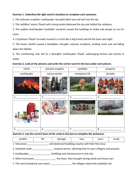 Exercise 2. Look at the pictures and write the correct word in the box under each picture. victim volcanic eruption landslide property earthquake rescue worker emergency kit tornado 1. ________________ 2. ________________ 3. ________________ 4. ________________ 5. ________________ 6. ________________ 7. ________________ 8. ________________