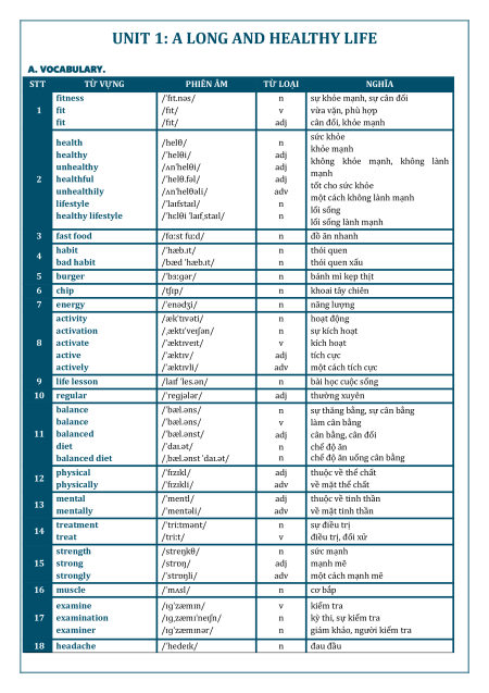 UNIT 1: A LONG AND HEALTHY LIFE A. VOCABULARY. STT TỪ VỰNG PHIÊN ÂM TỪ LOẠI NGHĨA fitness /ˈfɪt.nəs/ n