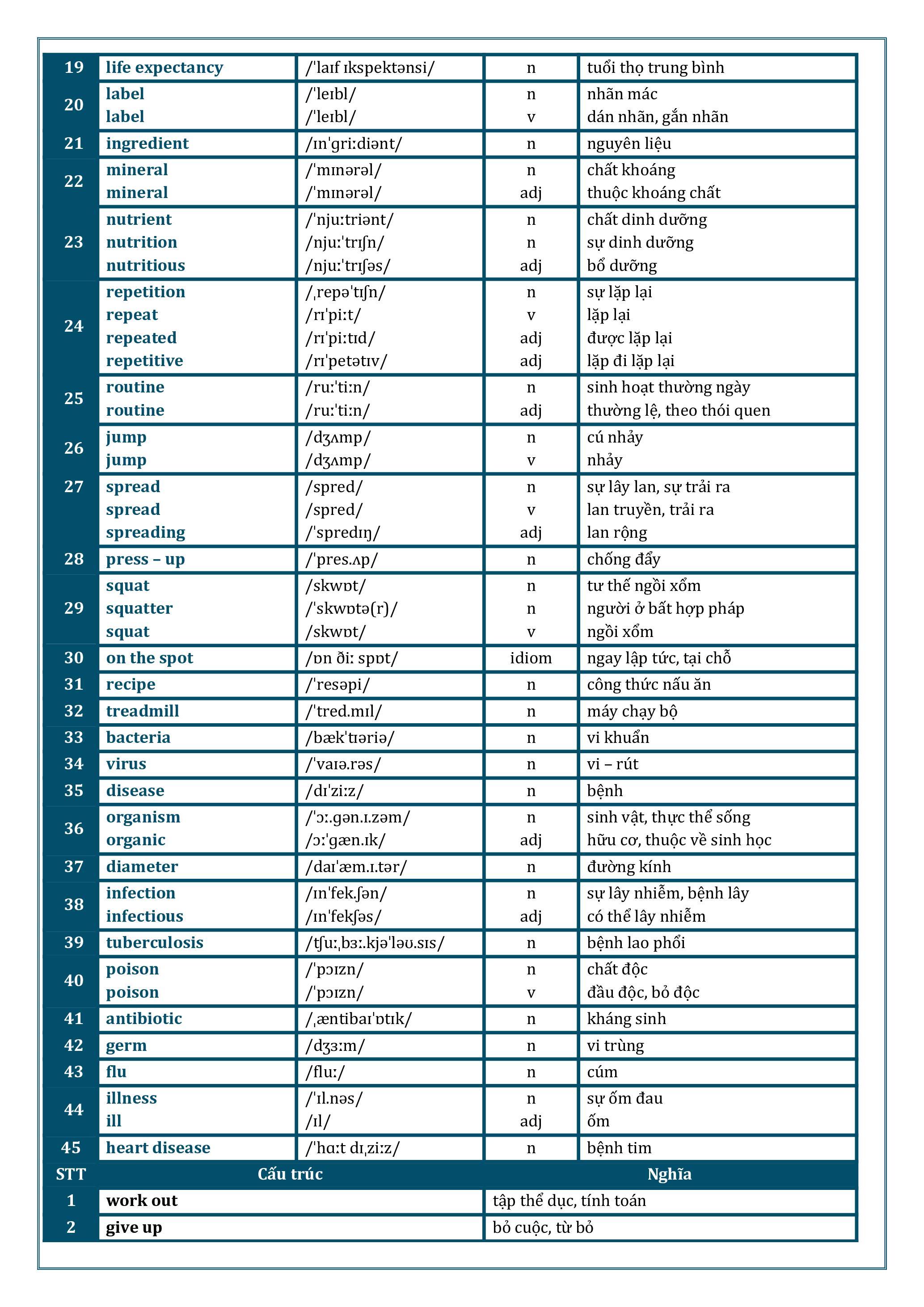 /tʃuːˌbɜː.kjəˈləʊ.sɪs/ n bệnh lao phổi poison 40 /ˈpɔɪzn/ n chất độc poison /ˈpɔɪzn/ v đầu độc, bỏ độc 41 antibiotic /ˌæntibaɪˈɒtɪk/ n kháng sinh 42 germ /dʒɜːm/ n vi trùng 43 flu /fluː/ n cúm illness 44 /ˈɪl.nəs/ n sự ốm đau ill /ɪl/ adj ốm 45 heart disease /ˈhɑːt dɪˌziːz/ n bệnh tim STT Cấu trúc Nghĩa 1 work out tập thể dục, tính toán 2 give up bỏ cuộc, từ bỏ 3 stay up thức (không đi ngủ) stop to do sth 4