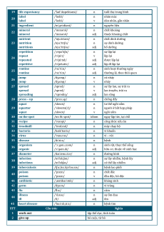 thường lệ, theo thói quen 26 jump /dʒʌmp/ n cú nhảy jump /dʒʌmp/ v nhảy 27 spread /spred/ n sự lây lan, sự trải ra spread /spred/ v lan truyền, trải ra spreading /ˈspredɪŋ/ adj lan rộng 28 press – up /ˈpres.ʌp/ n chống đẩy squat /skwɒt/ n tư thế ngồi xổm 29 squatter /ˈskwɒtə(r)/ n người ở bất hợp pháp squat /skwɒt/ v ngồi xổm 30 on the spot /ɒn ðiː spɒt/ idiom ngay lập tức, tại chỗ 31 recipe /ˈresəpi/ n công thức nấu ăn 32 treadmill /ˈtred.mɪl/ n máy chạy bộ 33 bacteria /bækˈtɪəriə/ n vi khuẩn 34 virus /ˈvaɪə.rəs/ n vi – rút 35 disease /dɪˈziːz/ n bệnh organism 36 /ˈɔː.ɡən.ɪ.zəm/ n