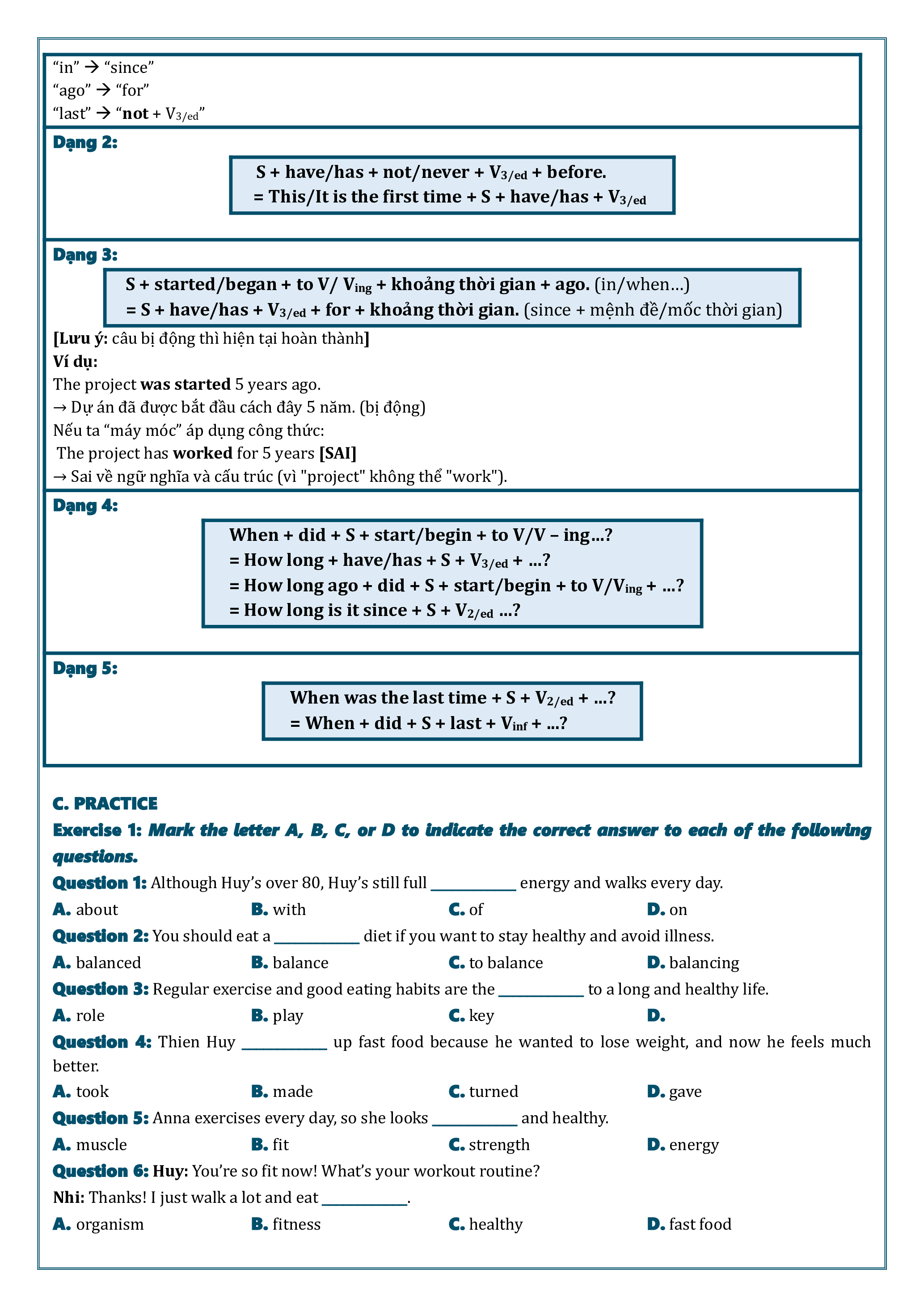 học hỏi điều gì từ ai 6 do/take exercise tập thể dục 7 spend time doing sth dành thời gian làm gì 8 stay healthy khỏe mạnh 9 suffer from