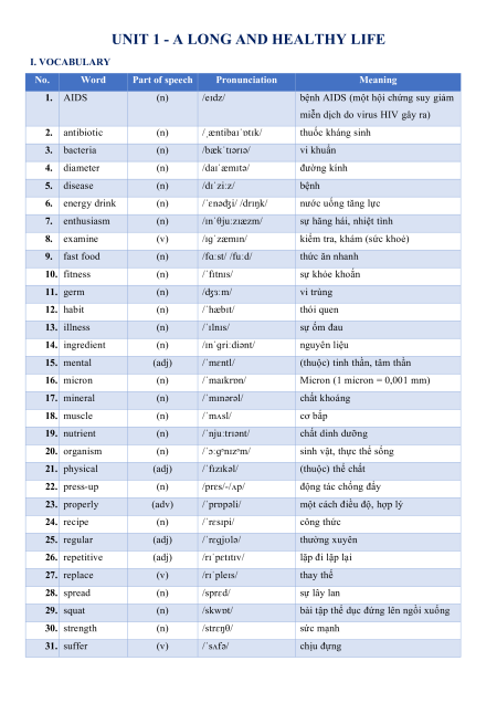 UNIT 1 - A LONG AND HEALTHY LIFE I. VOCABULARY No. Word Part of speech Pronunciation Meaning 1. AIDS (n) /eɪdz/