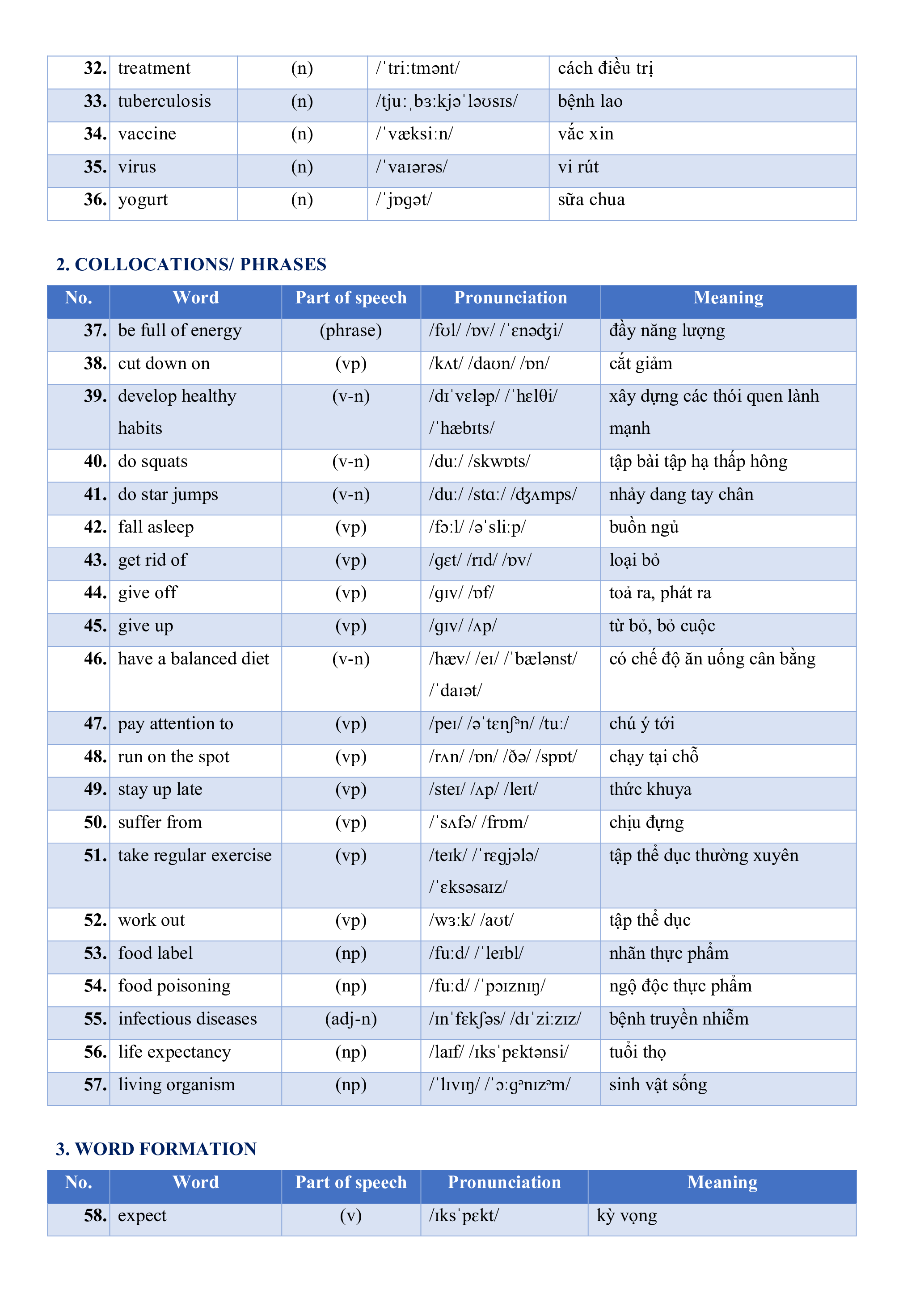 2. COLLOCATIONS/ PHRASES No. Word Part of speech Pronunciation Meaning 37. be full of energy (phrase) /fʊl/ /ɒv/ /ˈɛnəʤi/ đầy năng lượng 38. cut down on (vp) /kʌt/ /daʊn/ /ɒn/ cắt giảm 39. develop healthy (v-n) /dɪˈvɛləp/ /ˈhɛlθi/