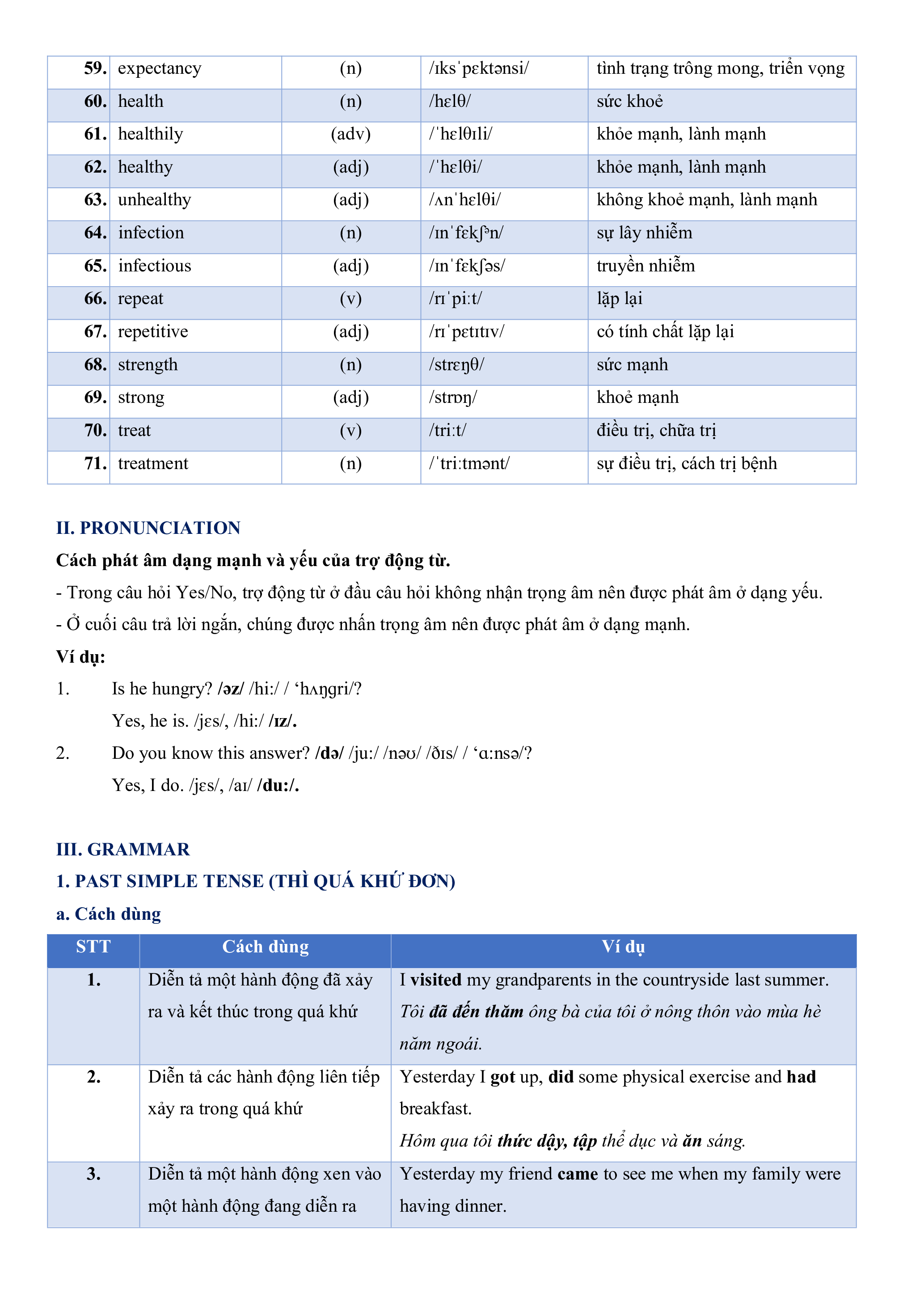bài tập thể dục đứng lên ngồi xuống 30. strength (n) /strɛŋθ/ sức mạnh 31. suffer (v) /ˈsʌfə/ chịu đựng 32. treatment (n) /ˈtriːtmənt/ cách điều trị 33. tuberculosis (n) /tjuːˌbɜːkjəˈləʊsɪs/ bệnh lao 34. vaccine (n) /ˈvæksiːn/ vắc xin 35. virus (n) /ˈvaɪərəs/ vi rút 36. yogurt (n) /ˈjɒɡət/ sữa chua