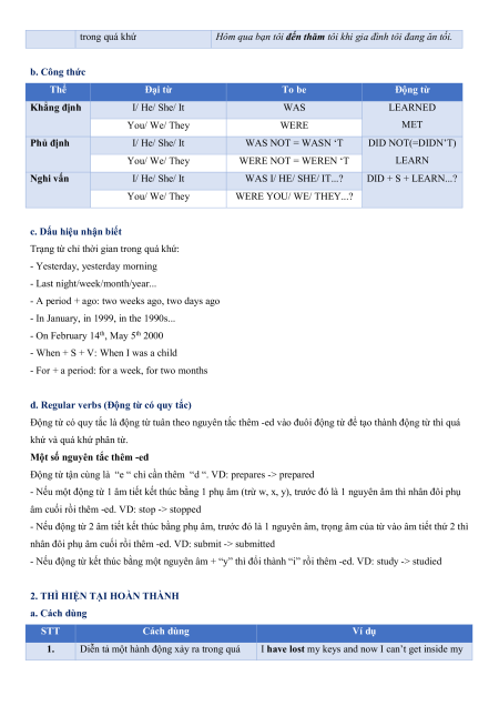 Hôm qua bạn tôi đến thăm tôi khi gia đình tôi đang ăn tối. b. Công thức Thể Đại từ To be Động từ Khẳng định I/ He/ She/ It WAS LEARNED You/ We/ They WERE MET Phủ định I/ He/ She/ It WAS NOT = WASN ‘T DID NOT(=DIDN’T) You/ We/ They WERE NOT = WEREN ‘T LEARN Nghi vấn I/ He/ She/ It WAS I/ HE/ SHE/ IT. .? DID + S + LEARN. .? You/ We/ They WERE YOU/ WE/ THEY. .?