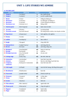 UNIT 1: LIFE STORIES WE ADMIRE A. VOCABULARY. Từ vựng Phiên âm Từ loại Nghĩa490882 1. Surgeon /ˈsɜːrdʒən/ n bác sĩ phẫu thuật 2. Surgery /ˈsɜːdʒəri/ n sự mổ, ca phẫu thuật 3. Resist /rɪˈzɪst/ v chống lại, kháng cự 4. Resistance /rɪˈzɪstəns/ n