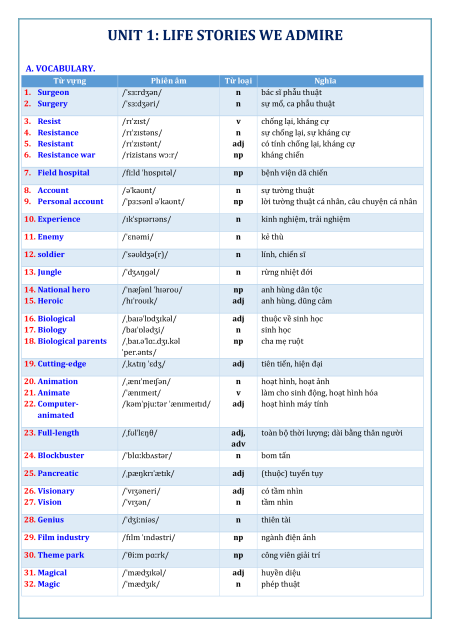 lời tường thuật cá nhân, câu chuyện cá nhân 10. Experience /ɪkˈspɪərɪəns/ n kinh nghiệm, trải nghiệm 11. Enemy /ˈɛnəmi/ n kẻ thù 12. soldier /ˈsəʊldʒə(r)/ n lính, chiến sĩ 13. Jungle /ˈdʒʌŋɡəl/ n rừng nhiệt đới 14. National hero /ˈnæʃənl ˈhɪəroʊ/ np anh hùng dân tộc 15. Heroic /hɪˈroʊɪk/ adj anh hùng, dũng cảm 16. Biological /ˌbaɪəˈlɒdʒɪkəl/ adj thuộc về sinh học 17. Biology /baɪˈɒlədʒi/ n sinh học 18. Biological parents /ˌbaɪ.əˈlɑː.dʒɪ.kəl np cha mẹ ruột ˈper.ənts/ 19. Cutting-edge /ˌkʌtɪŋ ˈɛdʒ/ adj tiên tiến, hiện đại 20. Animation /ˌænɪˈmeɪʃən/ n hoạt hình, hoạt ảnh 21. Animate /ˈænɪmeɪt/ v