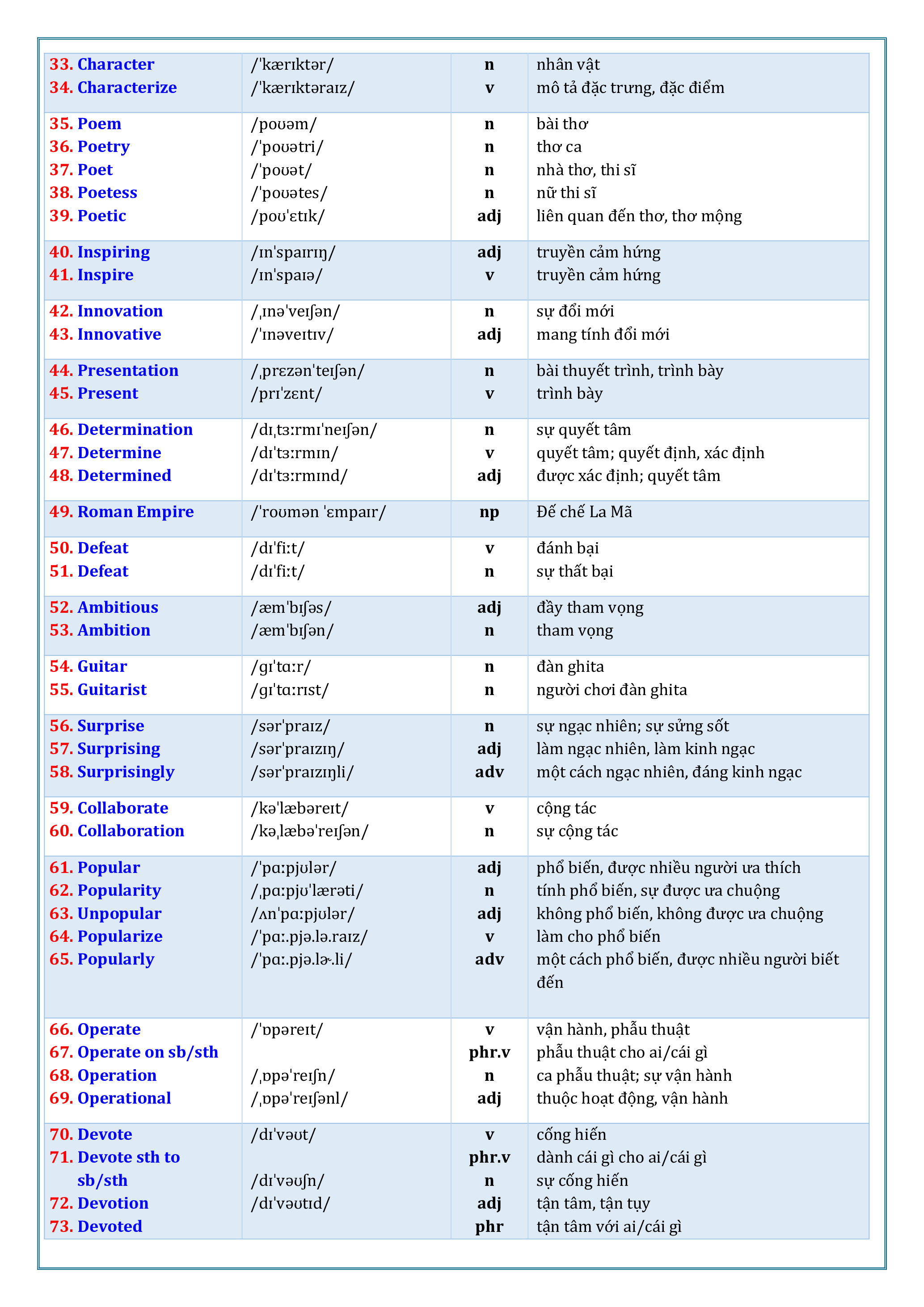 liên quan đến thơ, thơ mộng 40. Inspiring /ɪnˈspaɪrɪŋ/ adj truyền cảm hứng 41. Inspire /ɪnˈspaɪə/ v truyền cảm hứng 42. Innovation /ˌɪnəˈveɪʃən/ n sự đổi mới 43. Innovative /ˈɪnəveɪtɪv/ adj mang tính đổi mới 44. Presentation /ˌprɛzənˈteɪʃən/ n