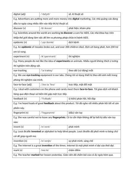 đầu tư ngày càng nhiều tiền vào tiếp thị kỹ thuật số. discover (v) /dɪˈskʌvər/ phát hiện, khám phá