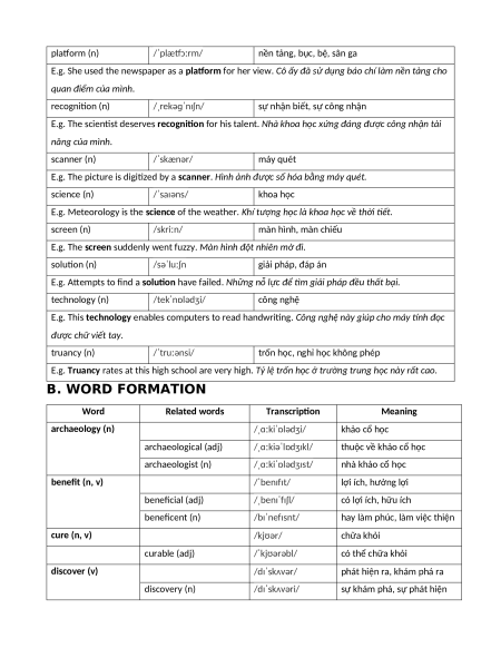 E.g. Truancy rates at this high school are very high. Tỷ lệ trốn học ở trường trung học này rất cao. B. WORD FORMATION Word Related words Transcription Meaning archaeology (n) /ˌɑːkiˈɒlədʒi/ khảo cổ học archaeological (adj) /ˌɑːkiəˈlɒdʒɪkl/ thuộc về khảo cổ học archaeologist (n) /ˌɑːkiˈɒlədʒɪst/ nhà khảo cổ học benefit (n, v) /ˈbenɪfɪt/ lợi ích, hưởng lợi beneficial (adj) /ˌbenɪˈfɪʃl/ có lợi ích, hữu ích beneficent (n) /bɪˈnefɪsnt/