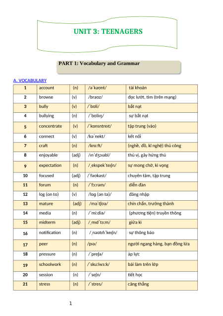 PART 1: Vocabulary and Grammar A. VOCABULARY 1 account (n) /əˈkaʊnt/ tài khoản 2 browse (v) /braʊz/
