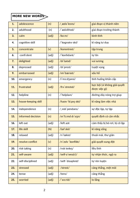 người ngang hàng, bạn đồng lứa 18 pressure (n) /ˈpreʃə/ áp lực 19 schoolwork (n) /ˈskuːlwɜːk/ bài làm trên lớp 20 session (n) /ˈseʃn/ tiết học 21 stress (n) /ˈstres/ căng thẳng 1 MORE NEW WORDS 1. adolescence (n) /ˌædəˈlesns/ giai đoạn vị thành niên 2. adulthood (n) /ˈædʌlthʊd/ giai đoạn trưởng thành 3. calm (adj) /kɑːm/ bình tĩnh 4. cognitive skill /ˈkɒɡnətɪv skɪl/ kĩ năng tư duy 5. concentrate (v) /kɒnsntreɪt/ tập trung 6. confi dent (adj) /ˈkɒnfɪdənt/ tự tin 7. delighted (adj) /dɪˈlaɪtɪd/ vui sương 8. depressed (adj) /dɪˈprest/ tuyệt vọng 9. embarrassed (adj) /ɪmˈbærəst/ xấu hổ 10. emergency (n) /iˈmɜːdʒənsi/ tình huống khẩn cấp