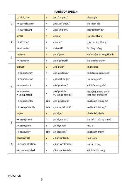 sự thích thú, sự thú vị 5 → enjoyable a /ɪnˈʤɔɪəbl/ thú vị → enjoyably adv /ɪnˈʤɔɪəbli/ một cách thú vị concentrate v /ˈkɒnsəntreɪt/ tập trung 6 → concentration n /ˌkɒnsənˈtreɪʃn/ sự tập trung → concentrated a /ˈkɒnsəntreɪtɪd/ có tính tập trung PRACTICE 3