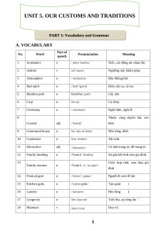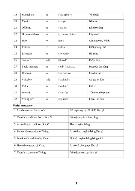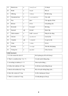 Tuổi thọ, sự sống lâu ’ 18 Maintain v /meɪnˈteɪn/ Duy trì : 1 19 Martial arts n /ˈmɑːrʃl ɑːrt/ Võ thuật 20 Monk n /mʌŋk/ Nhà sư 21 Offering n /ˈɒfərɪŋ/ Đồ thờ cúng 22 Ornamental tree n /ˌɔːnəˈmentl tri:/ Cây cảnh 23 Pray v /preɪ/ Cầu nguyện, lễ bái 24 Release v /rɪ'li:s/ Giải phóng, thả 25 Riverside n /'rɪvəsaɪd/ Bờ sông 26 Steamed adj /sti:md/ Được hấp 27 Table manners n /'teɪbl ˈmænərz/ Phép tắc ăn uống 28 Unicorn n /ˈjuːnɪkɔːrn/ Con kỳ lân 29 Valuable adj /ˈvæljuəbl/ Có giá trị lớn 30 Value n /ˈvæljuː/ Giá trị 31 Worship v /ˈwɜːrʃɪp/ Tôn thờ, thờ phụng 32 Young rice n /jʌŋ raɪs/ Cốm, lúa non Useful structures