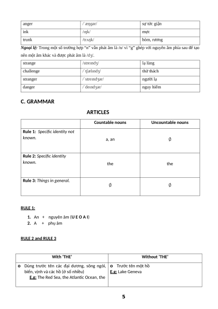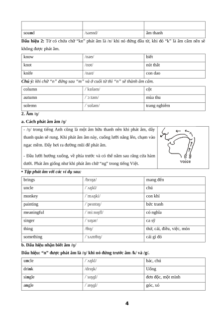 Dấu hiệu: “n” được phát âm là /ŋ/ khi nó đứng trước âm /k/ và /g/. uncle /ˈʌŋkl/ bác, chú drink /drɪŋk/ Uống single /ˈsɪŋɡl/ đơn độc, một mình angle /ˈæŋɡl/ góc, xó 4