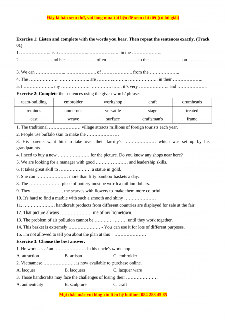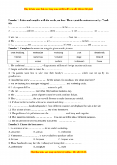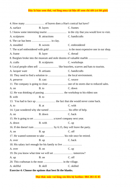 9. Local people often sell ………………… like bracelets, scarves and hats to tourists. A. lacquer ware B. artisans C. handicrafts