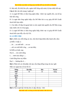 ủ Dế Mèn khi ra tay giúp đỡ Dế Cho t ắ thoát kh i ỏ b n nh ọ n ệ C. Cho th y ấ v ẻ đ p ẹ t ừ ngo i ạ hình và s c ứ m nh ạ h n ơ ngư i ờ c a ủ D ế Mèn trong tr n ậ chi n v ế i ớ võ sĩ b ng ọ a, ự D. Ca ng i ợ Dế Mèn có t m ấ lòng nghĩa hi p, ệ bênh v c ự và giúp đỡ Dế Cho t ắ thoát kh i ỏ c m ạ bẫy c a ủ ch C ị c. ố II. LUYỆN T P Ậ : Bài 1. Đi n vào ề chỗ trống các âm, v n t ầ hích h p ( ợ thêm d u t ấ hanh n u c ế n ầ ) a) Đi n 1 ho ề c n: ặ ….ên ….on m i ớ bi t ế ….on cao ….uôi con m i ớ bi t ế công ….ao mẹ thầy. b) Đi n ề an ho c ang: ặ Hoa b…. xòe cánh tr ng ắ L…. tư i ơ màu n ng v…. ắ Cánh hồng khoe n t ụ h m ắ Bay l…. hư ng ơ d u d…. ị