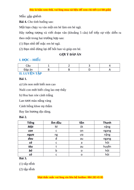 Bài 4. Cho tình hu ng s ố au: M t ộ b n ạ ch y ạ va vào m t ộ em bé làm em bé ngã. Hãy tư ng ở tư ng ợ và vi t ế đo n ạ văn (kho ng ả 5 câu) kể ti p ế sự vi c ệ di n ễ ra theo m t ộ trong hai trư ng h ờ p ợ sau: (1) B n ạ nh đ ỏ m ể c ặ em bé ngã. (2) B n ạ nh d ỏ ng l ừ i ạ đ h ể i ỏ han và giúp em bé. G I Ợ Ý ĐÁP ÁN I. Đ C Ọ – HIỂU Câu 1 2 3 4 Đáp án B B D A II. LUYỆN T P Ậ Bài 1. a) Lên non m i ớ bi t ế non cao Nuôi con m i ớ bi t ế công lao m t ẹ h y ầ b) Hoa ban xòe cánh tr ng ắ Lan tư i ơ màu n ng vàng ắ Cánh hồng khoe n t ụ h m ắ Bay làn hư ng ơ d u dàng. ị Bài 2. Tiếng Âm đầu Vần Thanh Một M ôt nặng con c on ngang ngựa ng ưa nặng đau đ au ngang cả c a hỏi tàu t au huyền bỏ b o hỏi cỏ c o hỏi Bài 3. (1) tấp t nh ể (2) t p t ậ nh ễ M i