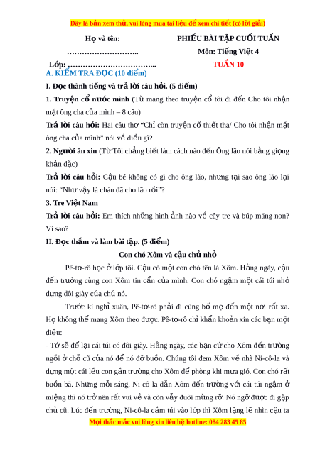 ớ ……………………………... TUẦN 10 A. KIỂM TRA Đ C Ọ (10 đi m ể ) I. Đ c ọ thành ti ng và t ế r l ả i ờ câu h i ỏ . (5 đi m ể ) 1. Truy n ệ cổ nư c