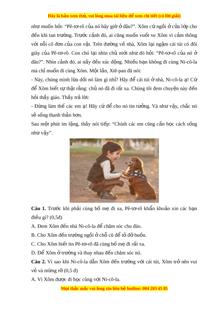 ả cùng bố mẹ đi xa, Pê-t - ơ rô kh n ẩ kho n ả xin các b n ạ đi u gì ề ? (0,5đ) A. Đem Xôm đ n nhà N ế i-cô-la đ chăm ể sóc chu đáo. B. Cho Xôm đ n t ế rư ng ờ ng i ồ ch ở cũ ỗ đ t ể đ ỏ bu ỡ n. ồ C. Cho Xôm bi t ế tin Pê-t - ơ rô đã cùng b m ố đi ẹ r t ấ xa. D. Đ X ể ôm t ở rư ng và t ờ hay nhau đ n chăm ế sóc nó.