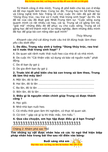 3. Điều gì là nguyên nhân chính giúp Trung có được thành công ? A. Học giỏi. B. Nhờ nhà bạn nuôi heo.