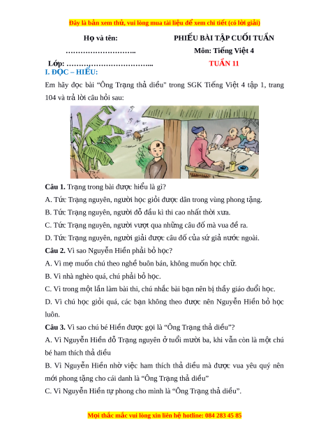 ớ ……………………………... TUẦN 11 I. Đ C Ọ – HIỂU: Em hãy đ c ọ bài “Ông Tr ng ạ thả di u" ề trong SGK Ti ng ế Vi t ệ 4 t p ậ 1, trang 104 và trả l i ờ câu h i ỏ sau: Câu 1. Tr ng t ạ rong bài đư c hi ợ u l ể à gì? A. T c ứ Tr ng nguyên, ạ ngư i ờ h c gi ọ i ỏ đư c