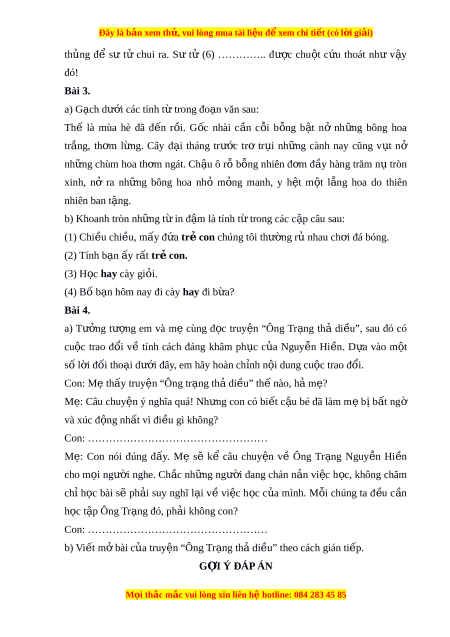 ủ để sư tử chui ra. Sư tử (6) ………….. đư c ợ chu t ộ c u ứ thoát như v y ậ đó! Bài 3. a) G ch d ạ ư i ớ các tính t t ừ rong đo n văn s ạ au: Thế là mùa hè đã đ n ế r i ồ . G c ố nhài c n ầ c i ỗ b ng ỗ b t ậ nở nh ng ữ bông hoa tr ng, ắ th m ơ l ng. ừ Cây đ i ạ tháng trư c ớ trơ tr i ụ nh ng ữ cành nay cũng v t ụ nở nh ng ữ chùm hoa th m ơ ngát. Ch u ậ ô r ỗ b ng ỗ nhiên đ m ơ đ y ầ hàng trăm n t ụ ròn xinh, nở ra nh ng ữ bông hoa nhỏ m ng ỏ manh, y h t ệ m t ộ l ng ẵ hoa do thiên nhiên ban t ng. ặ b) Khoanh tròn nh ng t ữ i ừ n đ m ậ là tính t t ừ rong các c p câu ặ sau: (1) Chi u chi ề u, ề m y đ ấ a ứ tr con ẻ chúng tôi thư ng r ờ nhau ch ủ i ơ đá bóng. (2) Tính b n ạ y r ấ t ấ tr con. ẻ (3) H c ọ hay cày gi i ỏ . (4) Bố b n