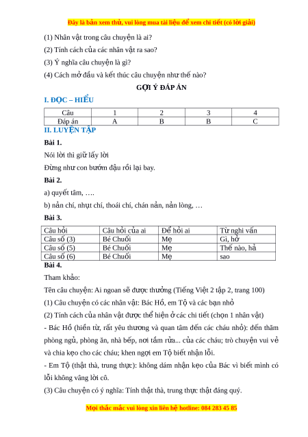 (3) Ý nghĩa câu chuyện là gì? (4) Cách m đ ở ầu và k t ế thúc câu chuy n nh ệ t ư hế nào? G I Ợ Ý ĐÁP ÁN I. Đ C Ọ – HIỂU Câu 1 2 3 4 Đáp án A B B C II. LUYỆN T P Ậ Bài 1. Nói l i ờ thì gi l ữ y l ấ i ờ Đ ng nh ừ con b ư ư m ớ đ u r ậ i ồ l i ạ bay. Bài 2. a) quy t ế tâm, …. b) n n ả chí, nh t