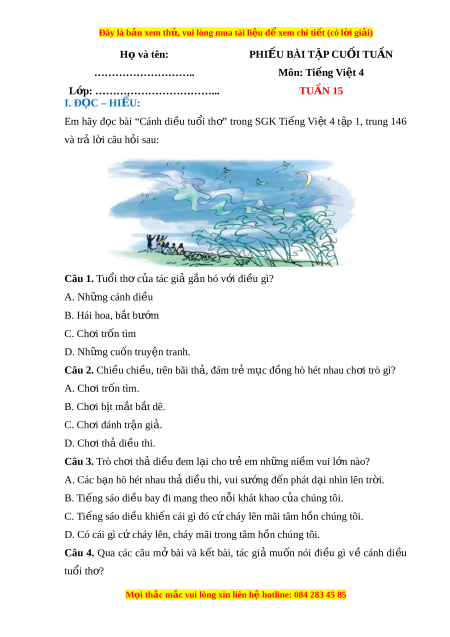 ớ ……………………………... TUẦN 15 I. Đ C Ọ – HIỂU: Em hãy đ c ọ bài “Cánh di u ề tu i ổ th ” ơ trong SGK Ti ng ế Vi t ệ 4 t p ậ 1, trung 146 và trả l i ờ câu h i ỏ sau: Câu 1. Tu i ổ thơ c a t ủ ác giả g n bó v ắ i ớ đi u ề gì? A. Nh ng cánh di ữ u ề B. Hái hoa, b t ắ bư m ớ C. Ch i ơ trốn tìm D. Nh ng cu ữ ốn truy n t ệ ranh. Câu 2. Chi u chi ề u, ề trên bãi th , ả đám tr m ẻ c đ ụ ng hò hét ồ nhau ch i ơ trò gì? A. Ch i ơ trốn tìm. B. Ch i ơ b t ị m t ắ b t ắ dê. C. Ch i ơ đánh tr n ậ gi . ả D. Ch i ơ thả di u t ề hi. Câu 3. Trò ch i ơ th di ả u đem ề l i ạ cho trẻ em nh ng ni ữ m ề vui l n ớ nào? A. Các b n hò hét ạ nhau thả di u t ề hi, vui sư ng ớ đ n phát ế d i ạ nhìn lên tr i ờ . B. Ti ng s ế áo di u bay đi ề mang theo n i ỗ khát khao c a ủ chúng tôi. C. Ti ng s ế áo di u khi ề n cái ế