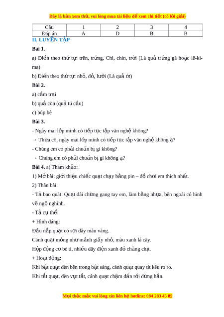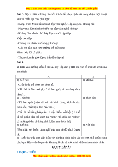 ệ đ xe ể m chi ti t ế (có l i ờ gi i ả ) Câu 1 2 3 4 Đáp án A D B B II. LUYỆN T P Ậ Bài 1. a) Đi n ề theo thứ t : ự trên, tr ng, ứ Chi, chín, tr i ờ (Là quả tr ng ứ gà ho c ặ lê-ki- ma) b) Đi n ề theo th t ứ : ự nh , đ ỏ , l ỏ ư i ỡ (Là qu ả t ớ ) Bài 2. a) c m ắ tr i ạ b) quả còn (qu t ả ú c u) ầ c) búp bê Bài 3. - Ngày mai l p m ớ ình có ti p t ế c t ụ p văn ậ ngh không? ệ → Th a cô, ngày m ư ai l p ớ mình có ti p ế t c t ụ p văn ngh ậ không ệ ? ạ - Chúng em có ph i ả chu n b ẩ gì ị không? → Chúng em có ph i