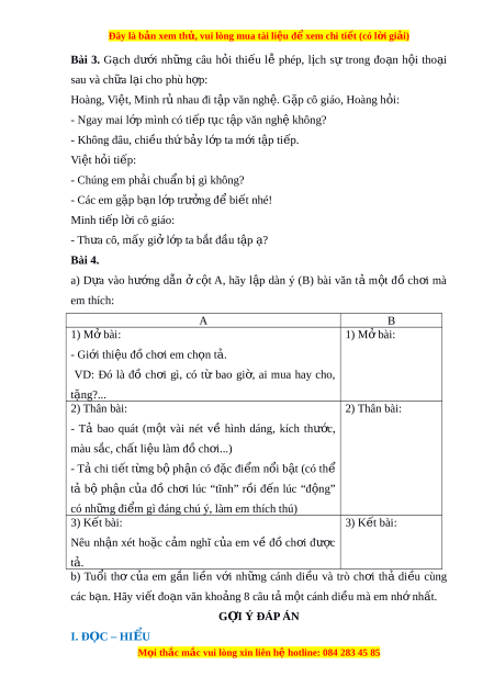 Hoàng, Việt, Minh r nhau đi ủ t p ậ văn ngh . G ệ p cô gi ặ áo, Hoàng h i ỏ : - Ngay mai l p m ớ ình có ti p t ế c t ụ p văn ậ ngh không? ệ - Không đâu, chi u t ề h b ứ y l ả p ớ ta m i ớ t p t ậ i p. ế Việt h i ỏ ti p: ế - Chúng em ph i ả chu n b ẩ gì ị không? - Các em g p ặ b n l ạ p t ớ rư ng đ ở bi ể t ế nhé! Minh ti p l ế i ờ cô giáo: - Th a ư cô, mấy giở l p t ớ a b t ắ đầu t p ậ ? ạ Bài 4. a) D a ự vào hư ng ớ d n ẫ ở c t ộ A, hãy l p ậ dàn ý (B) bài văn t ả m t ộ đ ồ ch i ơ mà em thích: A B 1) M bài ở : 1) M bài ở : - Gi i ớ thi u đ ệ ồ ch i ơ em ch n ọ t . ả VD: Đó là đồ ch i ơ gì, có từ bao gi , ờ ai mua hay cho, t ng?... ặ 2) Thân bài: 2) Thân bài: - Tả bao quát (m t
