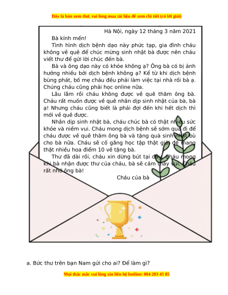 a. Bức thư trên bạn Nam gửi cho ai? Để làm gì?