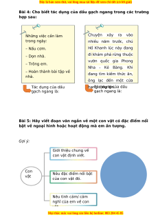 Bài 4: Cho biết tác dụng của dấu gạch ngang trong các trường hợp sau: Chuyện xảy ra vào Những việc cần làm trong ngày: nhiều năm trước, chú – Nấu cơm. Hồ Khanh lúc này đang đi khám phá rừng thuộc – Dọn nhà. vườn quốc gia Phong – Trông em. Nha - Kẻ Bàng. Khi