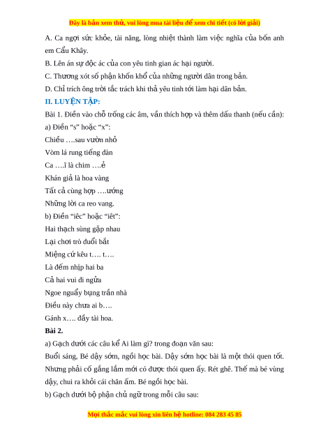 ệ đ xe ể m chi ti t ế (có l i ờ gi i ả ) A. Ca ng i ợ s c ứ kh e, ỏ tài năng, lòng nhi t ệ thành làm vi c ệ nghĩa c a ủ b n ố anh em Cẩu Khây. B. Lên án sự đ c ác c ộ a ủ con yêu tinh gian ác h i ạ ngư i ờ . C. Thư ng ơ xót số ph n kh ậ ốn khổ c a nh ủ ng ng ữ ư i ờ dân trong b n. ả D. Chỉ trích ông tr i ờ t c ắ trách khi th yêu t ả inh t i ớ làm h i ạ dân b n. ả II. LUYỆN T P Ậ : Bài 1. Đi n vào ề chỗ tr ng các âm ố , v n t ầ hích h p và t ợ hêm d u t ấ hanh (n u c ế n ầ ): a) Đi n “s ề ” ho c “x”: ặ Chi u ….s ề au vư n nh ờ ỏ Vòm lá rung ti ng đàn ế Ca ….ĩ là chim …. ẻ Khán gi l ả à hoa vàng Tất cả cùng h p …. ợ ư ng ớ Nh ng l ữ i ờ ca reo vang. b) Đi n ề “iêc” ho c ặ “iêt”: Hai th ch ạ sùng g p ặ nhau L i ạ ch i ơ trò đu i ổ b t ắ Miệng c kêu ứ t…. t…. Là đ m ế nh p hai ị ba Cả hai vui đi ng a ử Ngoe nguẩy b ng t ụ rần nhà Đi u này ch ề a ư ai b…. Gánh x…. đầy tài hoa. Bài 2. a) G ch d ạ ư i