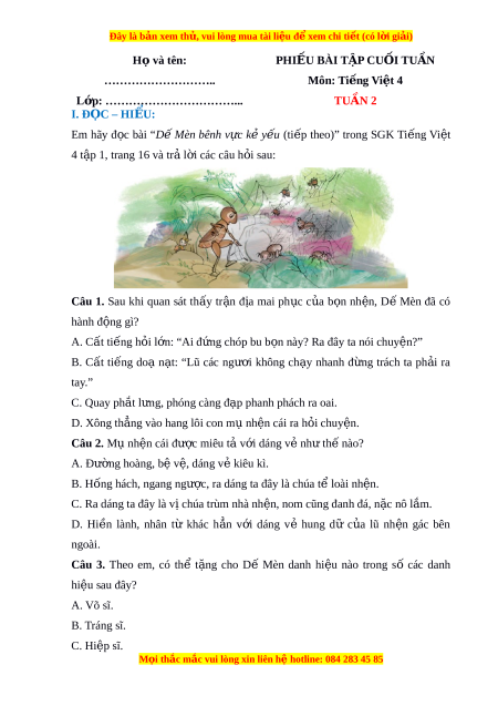 ọ bài “Dế Mèn bênh v c ự kẻ y u ế (ti p ế theo)” trong SGK Ti ng ế Vi t ệ 4 t p 1, t ậ rang 16 và tr l ả i ờ các câu h i ỏ sau: