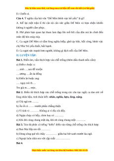 Câu 1. Sau khi quan sát th y ấ tr n ậ đ a ị mai ph c ụ c a ủ b n ọ nh n, ệ D ế Mèn đã có hành đ ng gì ộ ? A. Cất ti ng h ế i ỏ l n: ớ “Ai đ ng ứ chóp bu b n này? R ọ a đây ta nói chuy n?” ệ B. Cất ti ng ế doạ n t ạ : “Lũ các ngư i ơ không ch y ạ nhanh đ ng ừ trách ta ph i ả ra tay.” C. Quay ph t ắ l ng, phóng càng đ ư p ạ phanh phách ra oai. D. Xông th ng vào ẳ hang lôi con m nh ụ n cái ệ ra h i ỏ chuy n. ệ Câu 2. M nh ụ ện cái đư c m ợ iêu tả v i ớ dáng vẻ nh t ư h nào? ế A. Đư ng hoàng, ờ b v ệ , dáng v ệ ki ẻ êu kì.