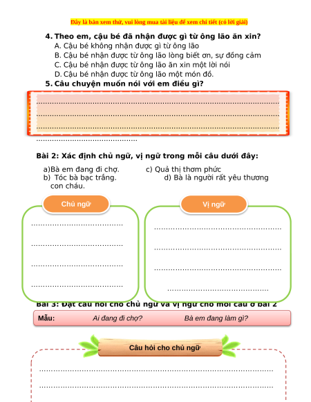 Bài 3: Đặt câu hỏi cho chủ ngữ và vị ngữ cho mỗi câu ở bài 2