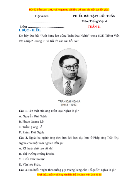 ọ bài “Anh hùng lao đ ng ộ Tr n ầ Đ i ạ Nghĩa” trong SGK Ti ng ế Vi t ệ l p 4 t ớ p 2 - ậ trang 21 và tr l ả i ờ các câu h i ỏ sau: Câu 1. Tên th t ậ c a ủ ông Tr n Đ ầ i ạ Nghĩa là gì? A. Nguy n Đ ễ i ạ Nghĩa B. Ph m ạ Quang L ễ C. Trần Quang Lễ D. Ph m ạ Đ i ạ Nghĩa