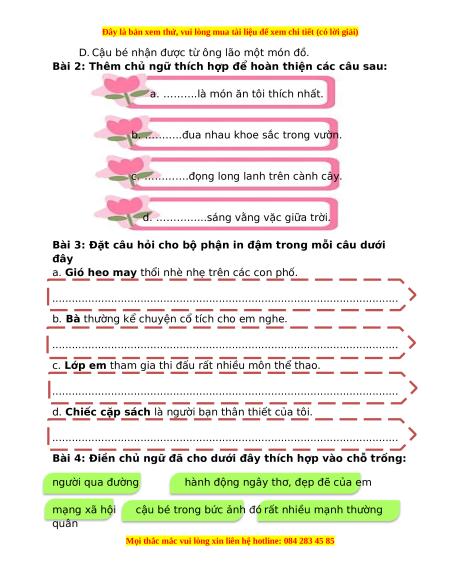 Bài 2: Thêm chủ ngữ thích hợp để hoàn thiện các câu sau: