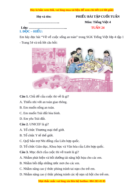 Câu 2. UNICEF là gì? A. Tổ ch c ứ Thư ng m ơ i ạ th gi ế i ớ . B. Tổ ch c ứ Y t t ế h gi ế i ớ . C. Qu b ỹ o ả trợ Nhi đ ng c ồ a ủ Liên h p ợ qu c. ố D. Tổ ch c G ứ iáo d c, ụ Khoa h c và ọ Văn hóa c a ủ Liên h p ợ qu c. ố Câu 3. M c ụ đích c a cu ủ c ộ thi v t ẽ ranh là gì? A. Nh m ằ phát hi n và b ệ ồi dư ng t ỡ ài năng h i ộ h a cho các ọ em. B. Nh m ằ bồi đ p ắ nh ng ữ ư c ớ m cho các em ơ . C. Nh m ằ nâng cao ý th c phòng t ứ ránh tai n n ạ cho tr em ẻ . D. Nh m ằ nâng cao ý th c phòng t ứ ránh các t n ệ n ạ xã h i ộ cho tr em ẻ . M i