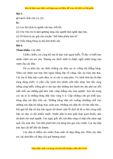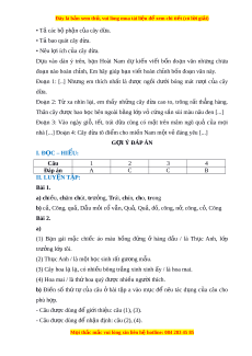 ệ đ xe ể m chi ti t ế (có l i ờ gi i ả ) • T các ả b ph ộ n ậ c a cây d ủ a. ừ • T bao quát ả cây d a. ừ • Nêu l i ợ ích c a ủ cây d a. ừ D a ự vào dàn ý trên, b n ạ Hoài Nam dự ki n ế vi t ế b n ố đo n ạ văn nh ng ư ch a ư đo n nào hoàn ạ ch nh, E ỉ m hãy giúp b n ạ vi t ế hoàn ch nh b ỉ n đo ố n ạ văn này. Đo n ạ 1: [..] Nh ng ư em thích nh t ấ là đư c ợ ng i ồ dư i ớ bóng mát rư i ợ c a ủ cây d a. ừ Đo n ạ 2: Từ xa nhìn l i ạ , em th y ấ nh ng ữ cây d a ừ cao to, trông r t ấ th ng ẳ hàng. Thân cây đư c bao ợ b c bên ngoài ọ b ng ằ l p v ớ c ỏ ng s ứ n ầ sùi màu nâu đen [...] Đo n ạ 3: Vào ngày gi , ỗ t t ế , trái d a ừ cũng có m t ặ trên mâm ngũ quả c a ủ m i ọ nhà [...] Đo n ạ 4: Cây d a ừ tô đi m ể cho mi n ề Nam m t ộ v đáng yêu [ ẻ ...] G I Ợ Ý ĐÁP ÁN I. Đ C Ọ – HIỂU: Câu 1 2 3 4 Đáp án A C C B II. LUYỆN T P Ậ : Bài 1. a) chi u